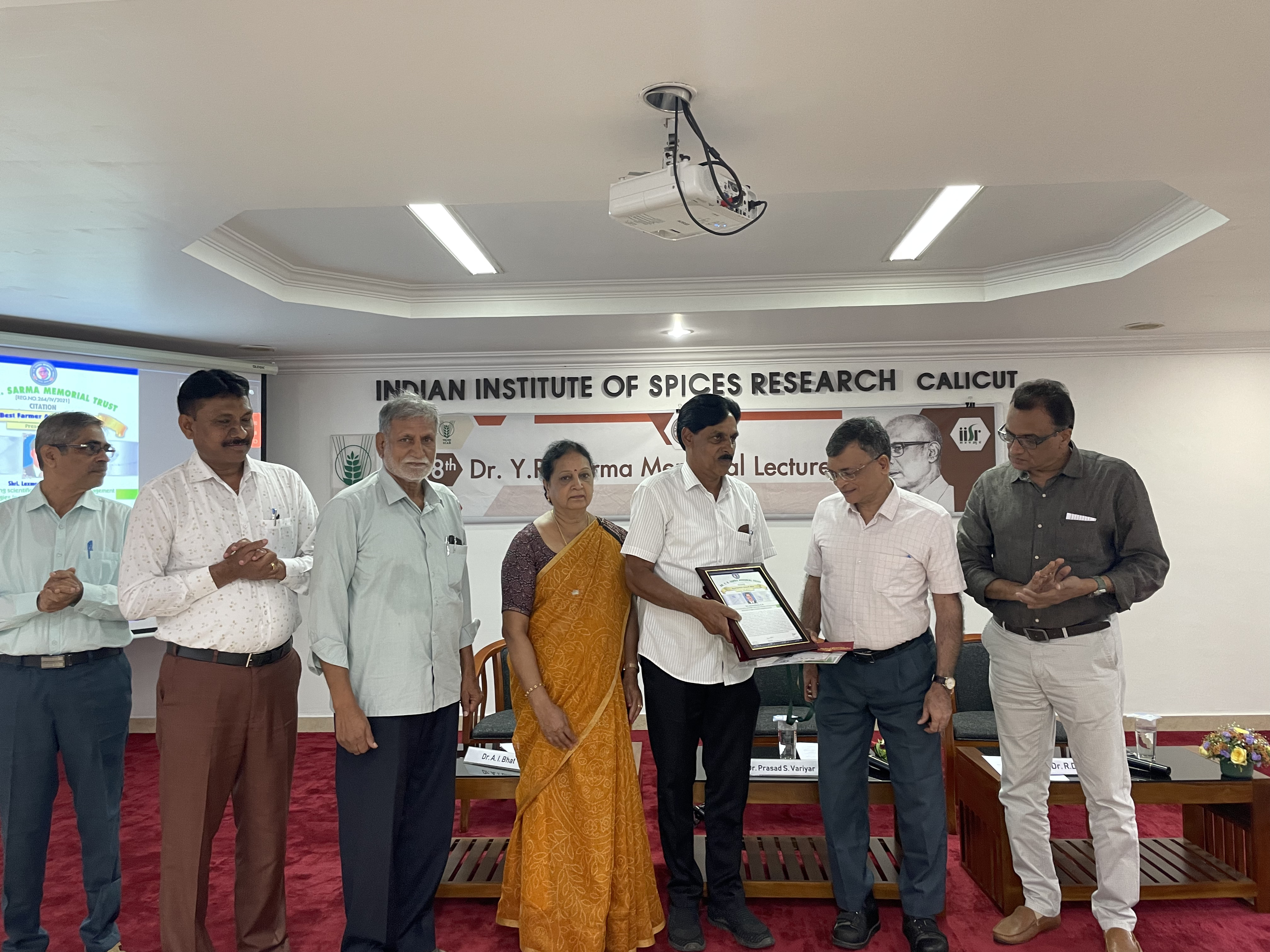 The ceremony also saw the presentation of the Best Farmer 2024 Award, instituted by the Dr. Y.R. Sarma Memorial Trust. The award was given to Shri. Laxmana Gowda G.M., a progressive farmer from Mudigere, Chikkamagaluru, Karnataka, known for his exceptional cultivation of spices and plantation crops. Mr. Gowda's success lies in his approach, which combines traditional genotypes with high-yielding varieties like Panniyur 1, Sreekara, Subhakara, and IISR Thevam black pepper. He has also implemented sustainable practices by fortifying farmyard manure with bioinoculants and using recommended synthetic molecules judiciously to manage pests and diseases. The Trust recognized his efforts in adopting scientific plant protection strategies and promoting a sustainable intercropping system for spices and plantation crops.