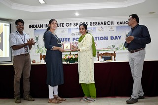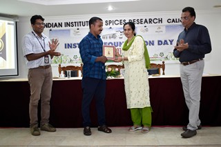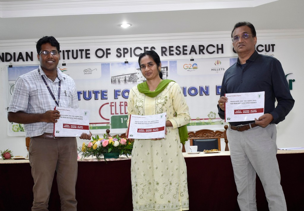 ICAR-Indian Institute of Spices Research celebrated its 48th foundation day on 3rd July 2023. Dr. R Dinesh, Director, ICAR-IISR welcomed the gathering and envisaged on the changing priority of the research and allied activities of ICAR in general and IISR in particular. Dr. Sudhakar Pandey, Assistant Director General (Horticultural Sciences), ICAR presided over the function. He emphasized regarding the futuristic strategy of the institute to achieve better heights. Institute honored its employees for their contributions for the cause of spices. This year’s award of excellence were awarded to Dr. Priya George & Mrs. N Prasannakumari (Technical officer Category); Mrs. Shajina O (Techician Category), Mrs. Seema M (Administrative category) and Mr. Vijesh V (Skilled supporting staff Category). The best research paper award for the year was bagged by Mrs. Sreena C P for the paper entiled “Soil polluted with nano ZnO reveals unstable bacterial communities and decoupling of taxonomic and functional diversities”. As a part of Foundation Day celebrations, ICAR-IISR recognized the farmers and entrepreneurs for adopting and popularizing technologies developed by the institute. The Awards included certificate and a citation with their contributions in spice farming and development. Based on the recommendations of the selection committee, four awardees were selected for the year 2022-23 Viz. The Eco Development Committee, Pooppara (For their earnest efforts for enhancing farm income through intensified spice farming in tribal regions ); Mr. Martin P Alex, Perinchallur house, Thalayad, Kozhikode (For promoting modern black pepper varieties through planting material production); Mr Shankarrao Dinkar Khot, Satara, Maharashtra (For his innovative intercroping practices in ginger and turmeric); Mr Numan Adil (For his tireless efforts in promoting sustainable farming practices among black pepper farmers in Karnataka). Dr Sandhyarani, Professor & Dean, Research & Consultancy, NIT Calicut delivered foundation day lecture on “harnessing the potential of advanced materials for a greener future”. She emphasized on the potential use of Nano materials for energy production storage and agriculture. Former directors of ICAR-IISR Dr. V A Prthasarathy, Dr. Nirmal Babu, Dr. Santhosh J Eapen, Dr. Devasahayam and Dr. T J Zachariah delivered their felicitation address. Dr. Anees K, Organizing secretary delivered vote of thanks.